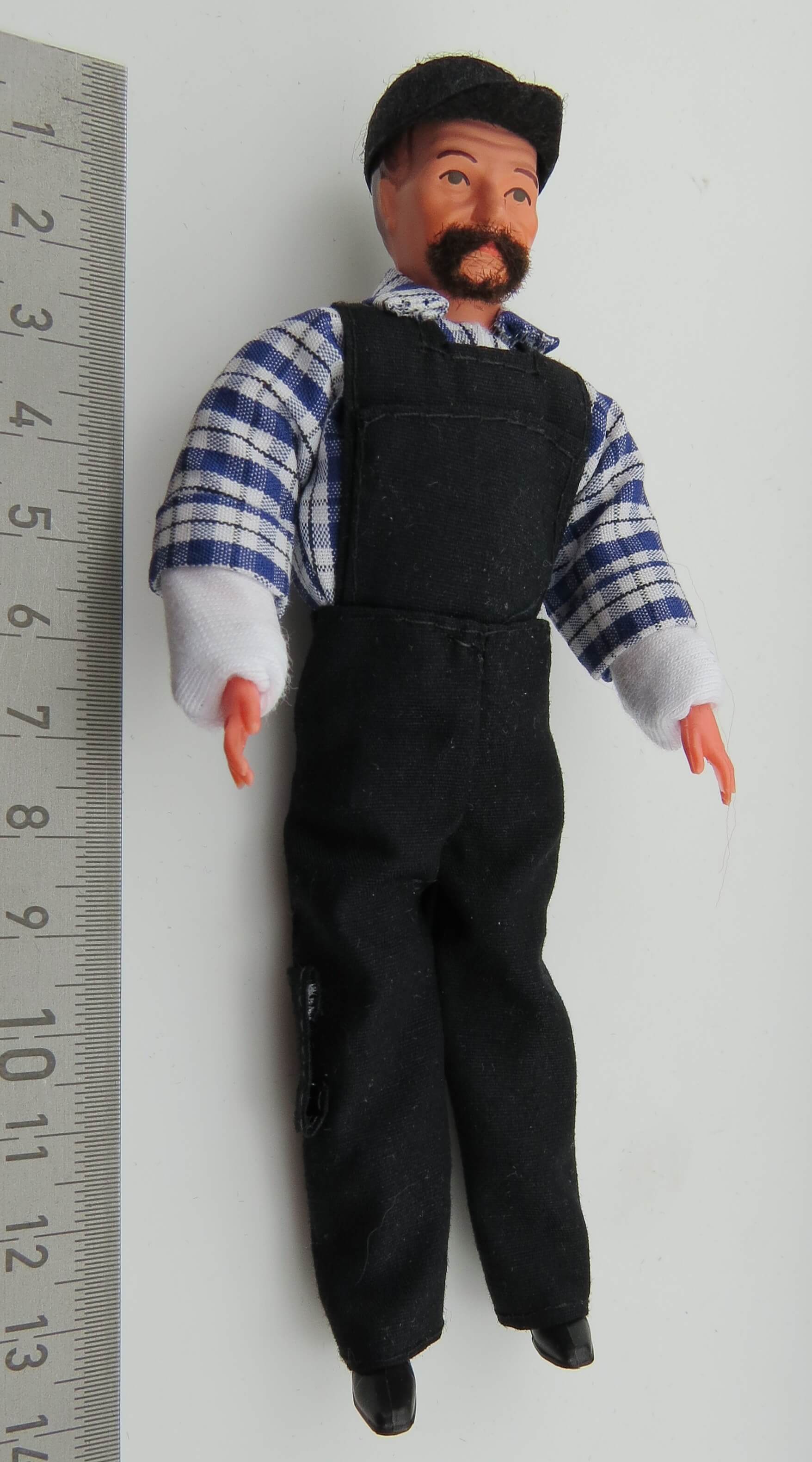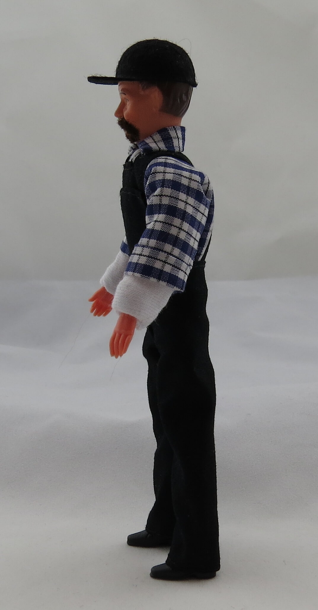 1x Biegepuppe Trucker ca. 14cm hoch mit schwarzer Latzhose, kariertem Hemd und Schildkappe. Arme, Beine und Kopf können in fast jede Position gebogen werden.
