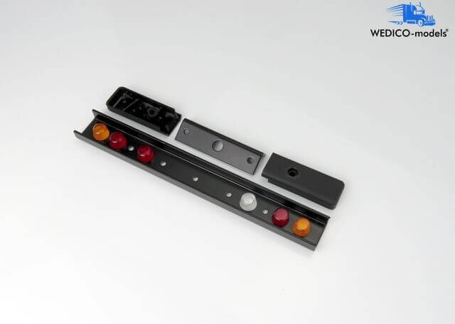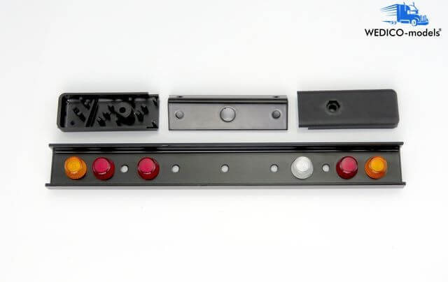 1x Stoßstange, Alu, schwarz mit runden Rückleuchten gelb + rot + klar (2206). Breite 160mm. Höhe 15mm. Tiefe 9mm. Mit Lampenhalter und Montagewinkel.