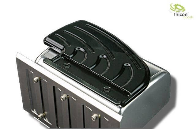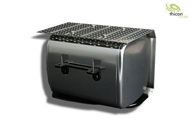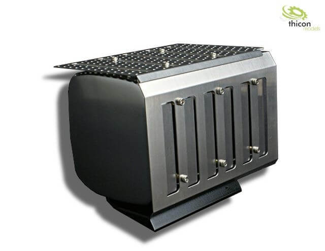 Auspuff, aus V2A, passend zu Mercedes- Benz AROCS mit Tamiya-Fahrwerken. Mit Rahmenhalterung, aus Alu und V2A. Mit Hitzeschild.
