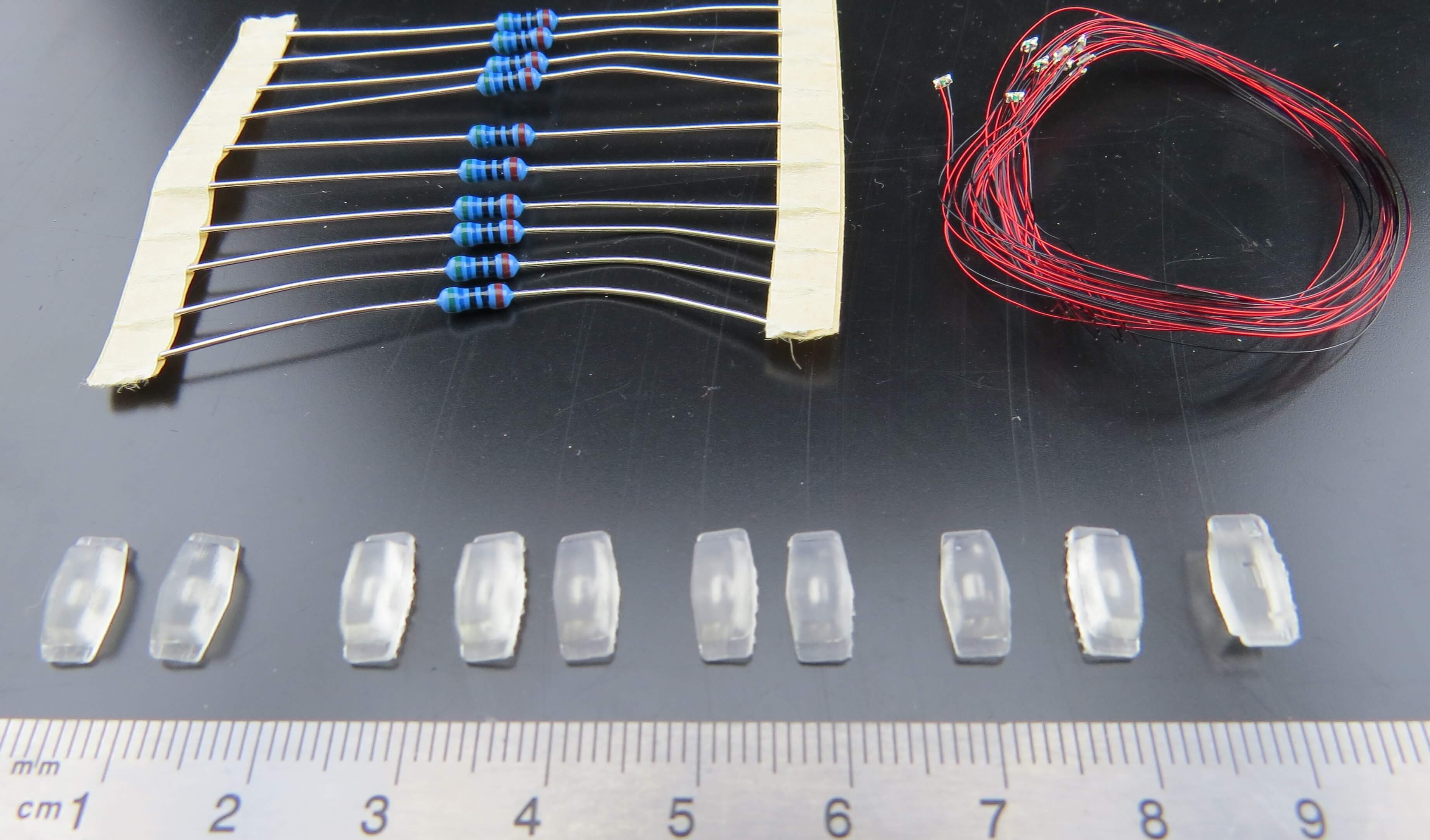 Begrenzungsleuchte V5 -gelb-, 10 Stück Aufbauleuchte, klar, mit gelber SMD-LED mit 15cm Kupferlackdraht (rot/ schwarz). 10 Vorwiderstände für 7,2-12V. LEDs müssen von hinten eingeklebt werden